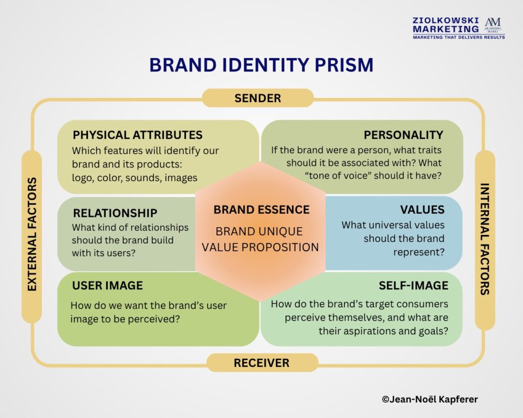 In projects focused on developing and implementing brand strategies, I use the Brand Identity Prism — a tool I first applied in 2003 while defining the brand strategy for Harnaś beer.