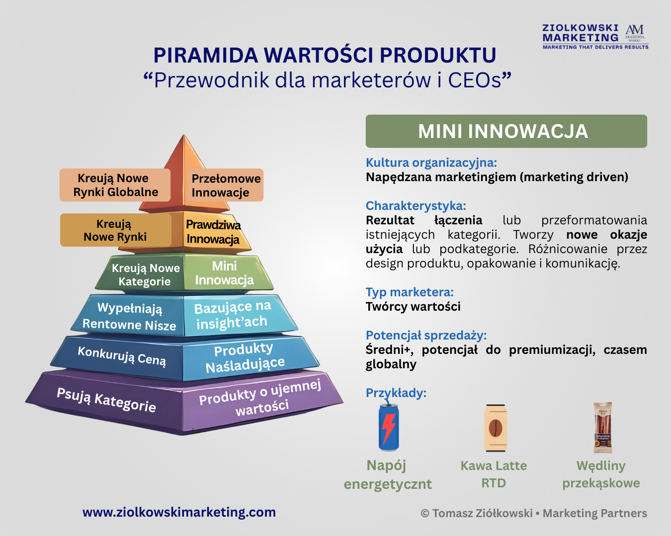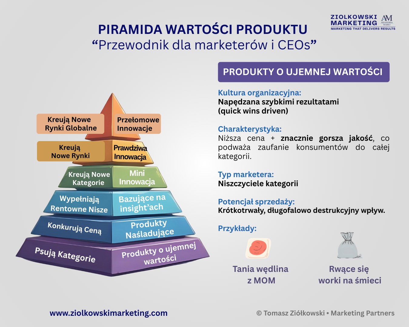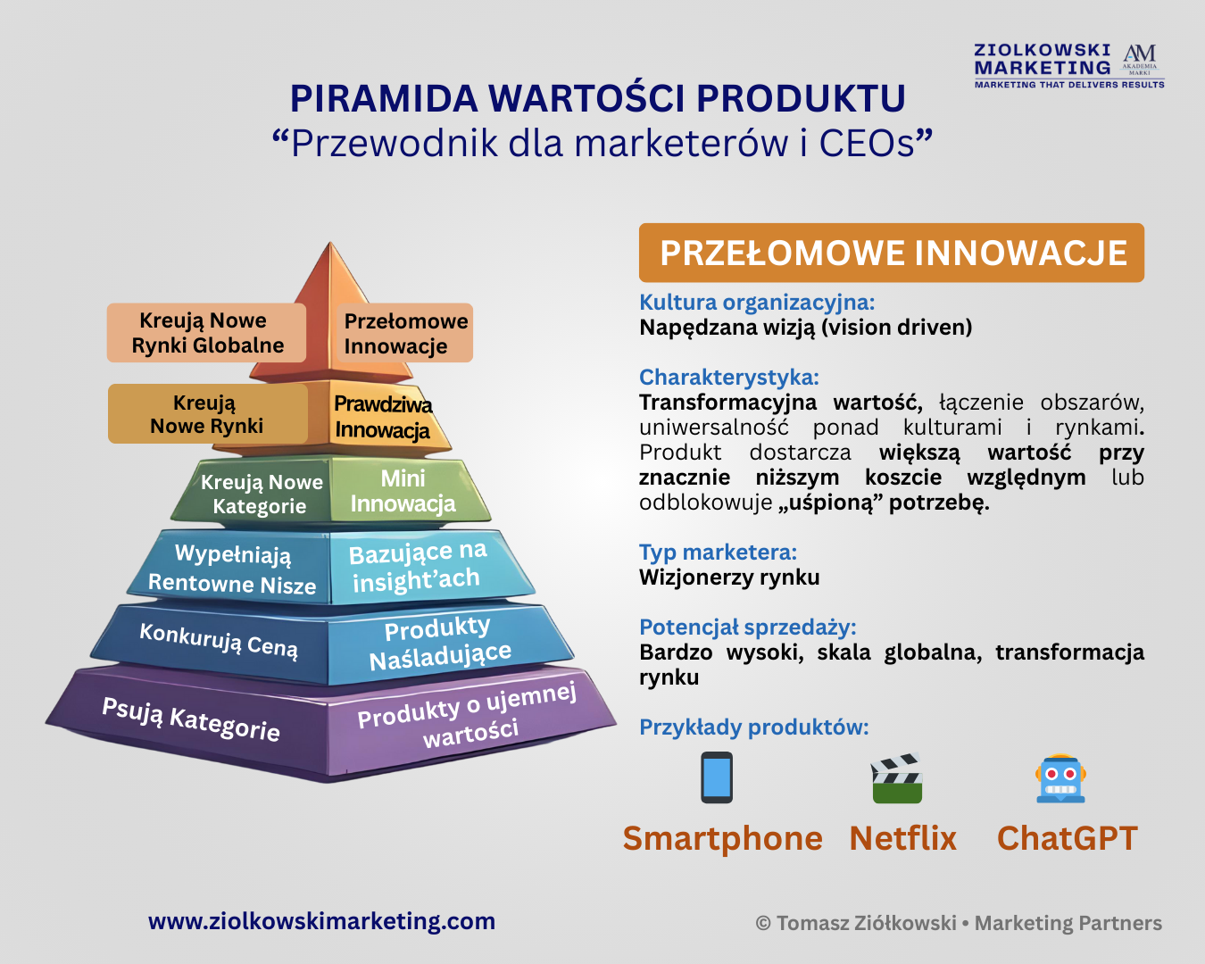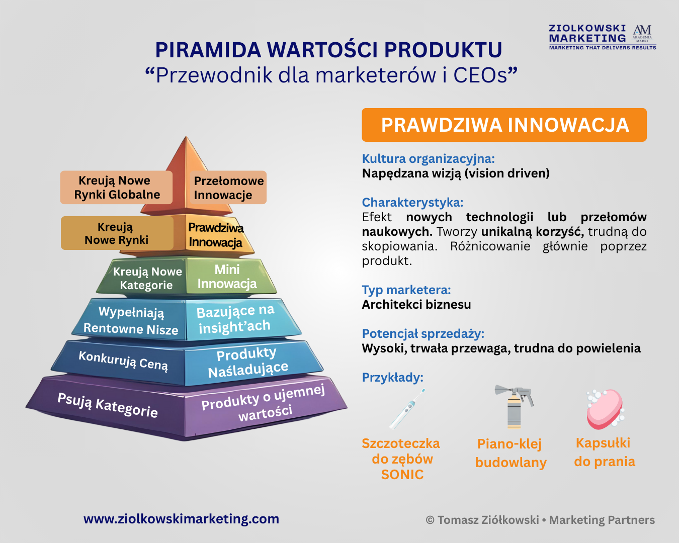 Piramida pokazuje sześć poziomów wartości, na których mogą funkcjonować nowe produkty – od przełomowych innowacji, które tworzą całkiem nowe rynki, aż po produkty o ujemnej wartości, które niszczą kategorię.